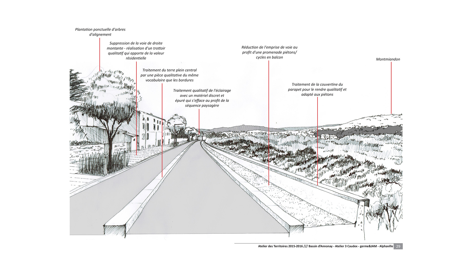 L’équipe pluridisciplinaire menée par Caudex s’enrichit des réflexions de l’agence d’urbanisme et d’architecture germe&Jam, ainsi que des programmistes d’Alphaville pour proposer des pistes de projet pour enrayer et maîtriser ces évolutions, lisibles bien au-delà de ce territoire d’étude particulier. Les propositions de ‘concentrer pour mieux rayonner’ et de ‘contenir pour intensifier’ sont arrivées très tôt dans la stratégie de projet, convaincus que la dynamique ne pourra être relancée que par le soutien de tout un territoire à sa centralité représentée par Annonay et sa périphérie. Exercice particulier mené par l’État depuis plusieurs années pour accompagner les services décentralisés à construire ce genre de projets et mettre les acteurs et élus « autour de la table » et envisager ensemble le futur de leur territoire. Caudex pilote avec ses partenaires l’animation de ces débats politiques et opérationnels lors d’Ateliers de co-construction avec élus, acteurs et services afin de faire émerger une stratégie de territoire partagée devant mener à terme à une feuille de route projectuelle pour les 20 années à venir.