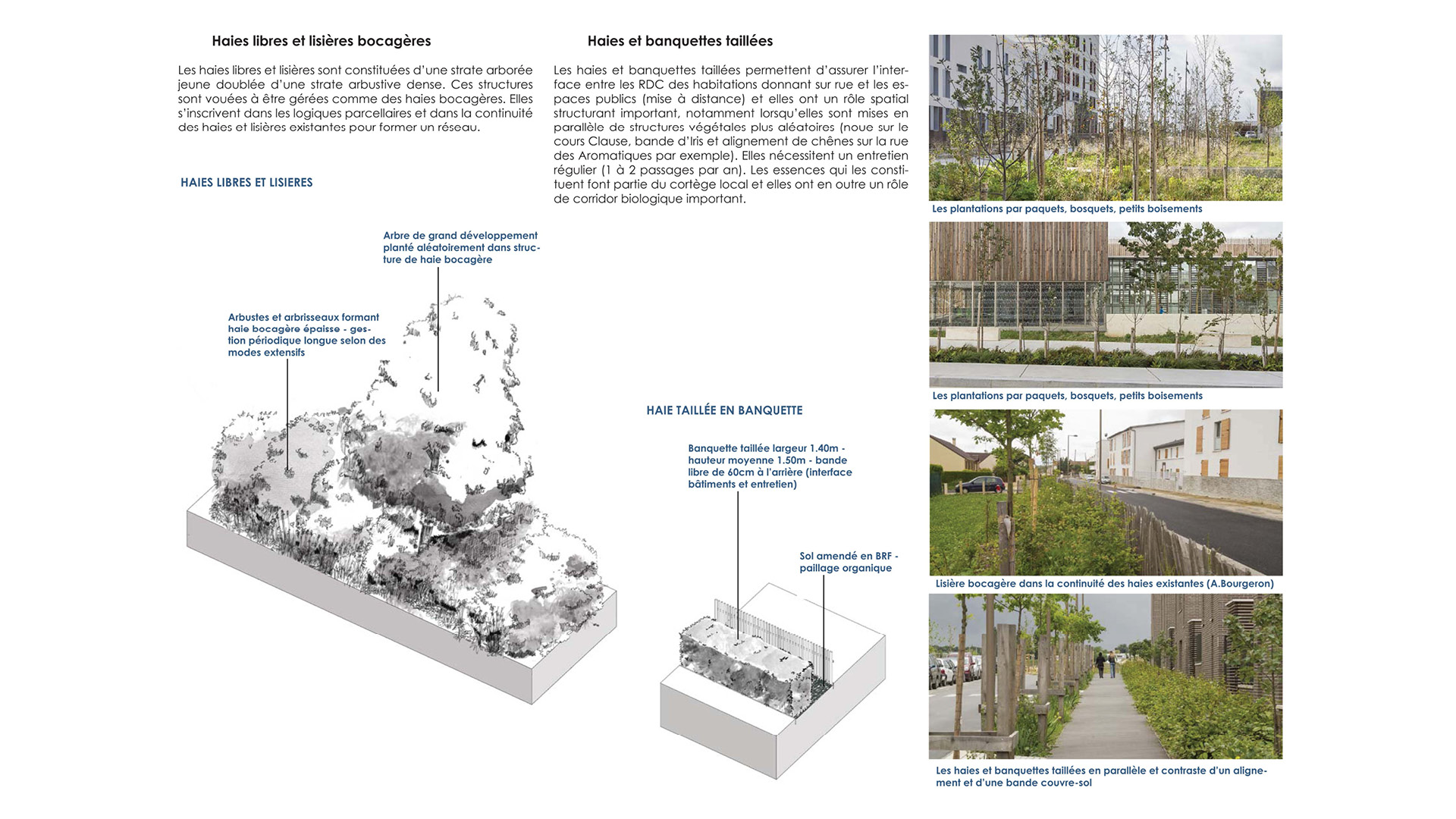 Projet et gestion : Le projet d’aménagement des espaces publics et privés du quartier s’appuie sur un cahier des charges qui définit les principes spatiaux et environnementaux. Le projet de plantation s’appuie en priorité sur les espèces indigènes caractéristiques du plateau, complété par des essences productives (fruitiers dans les parcelles privées notamment) ou ornementales adaptées à l’espace public pour leur robustesse et leur bonne tenue dans le temps.