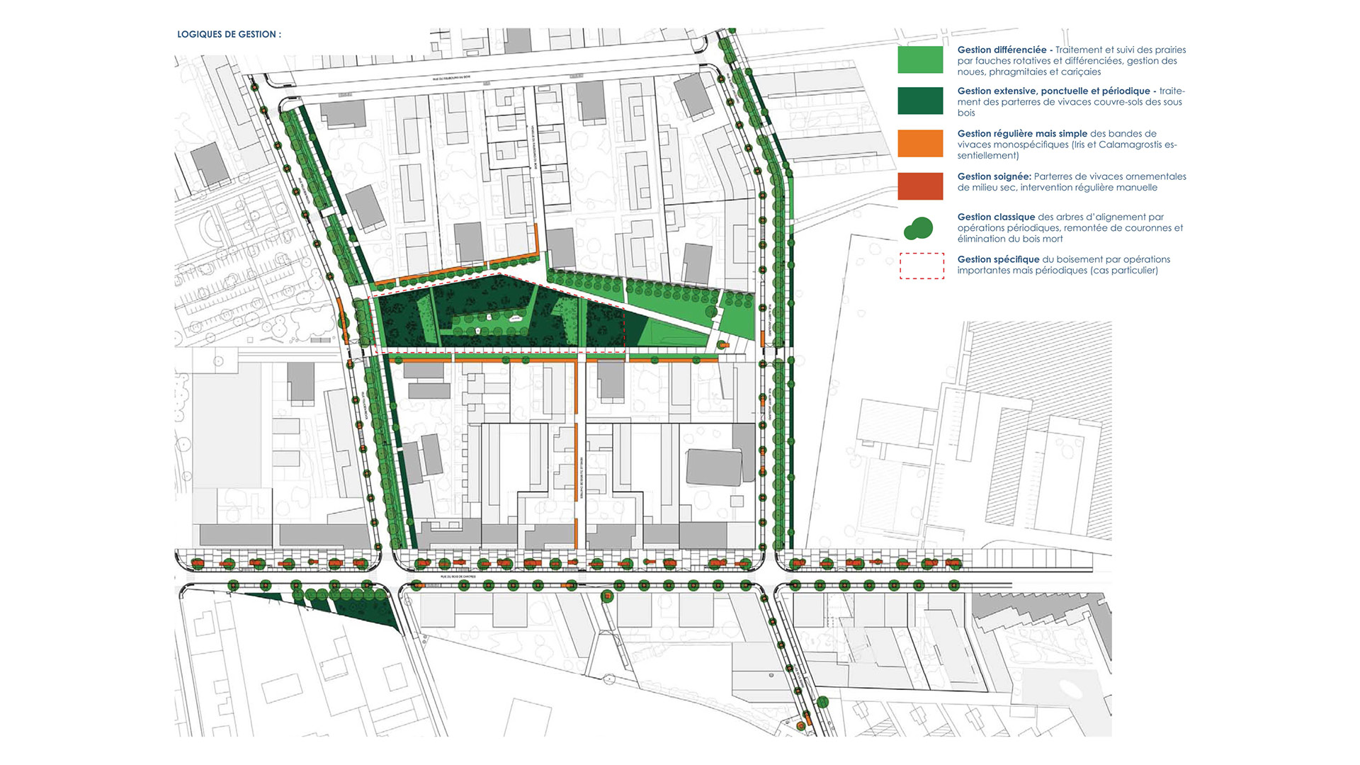 - Proposer des modes de gestion permettant de répondre aux enjeux spatiaux et ornementaux, tout en restant simples et rationnels pour limiter les coûts de gestion et d’entretien par les services de la ville